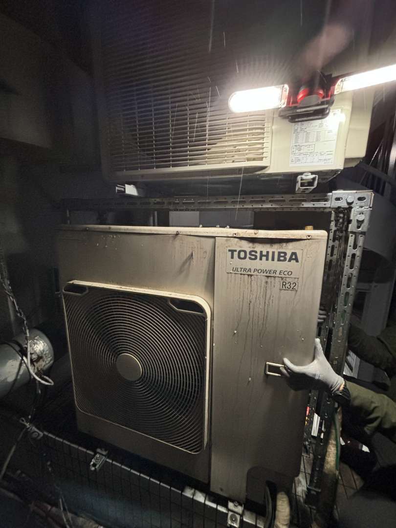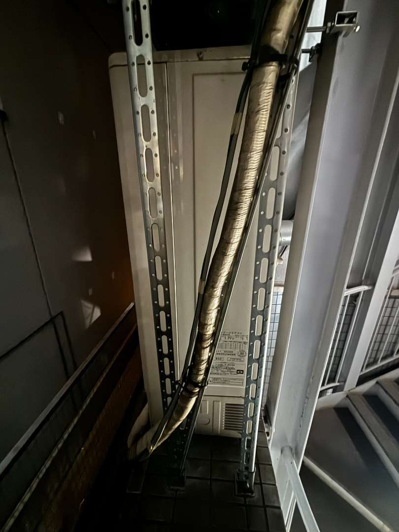 既設機器の撤去から新機器の搬入・設置、配管・配線の調整、試運転に至るまで、安全と丁寧さを第一に進行。屋外機の設置場所は外階段下の狭小スペースであったため、搬出入動線の確保や騒音・振動への配慮にも細心の注意を払いました。