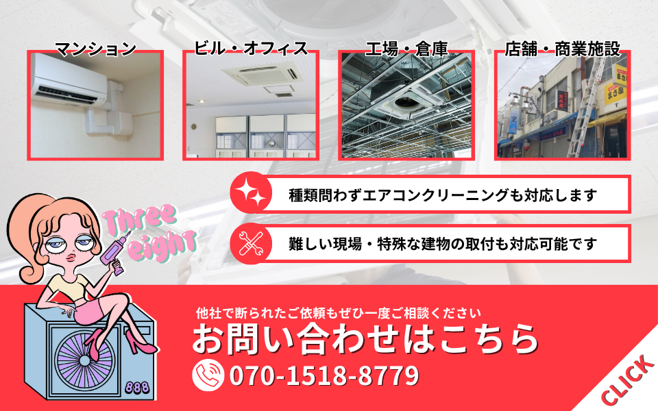 業務用エアコン工事を専門とするThree eight(スリーエイト)は、東京都大田区を拠点に東京23区全域のご相談に対応しています。丁寧な施工と正直なご提案で、他社で断られた現場にも柔軟に対応可能です。空調設備に関するお困りごとは、ぜひお気軽にご相談ください。